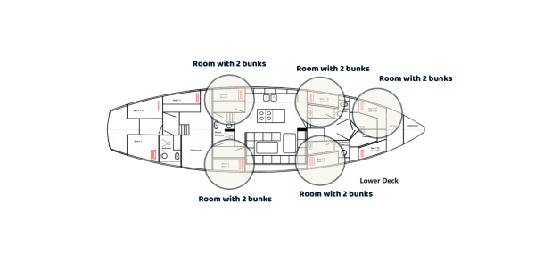 - Verblijf aan boord op basis van 2 personen per kamer. Een kamer bestaat uit 2 éénpersoonsbedden (stapelbed) met een gezamenlijke sanitaire ruimte.